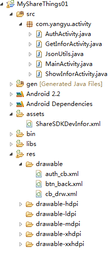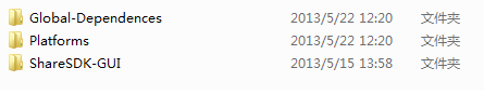 Libs包含ShareSDK的類庫,具體包括三個文件夾,分別是ShareSDK的全局依賴庫、ShareSDK當前支持的所有平台工具庫和ShareSDK可視化UI的一些支持庫。“全局依賴庫”是集成ShareSDK的基礎,ShareSDK的任何平台都依賴於這個庫,而“ShareSDK-GUI”提供的是一個測欄控件和一個快捷分享工具,以方便讀者更快速地集成ShareSDK。
