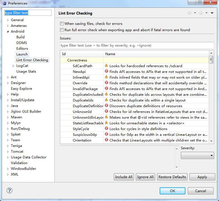 解決的辦法是:依照下面的路徑“Window —> Preferences —> android—> lint error checking”打開lint的配置頁面,然後去掉頁面頂部的兩個勾選,之後再clean項目就能處理。如下圖所示: