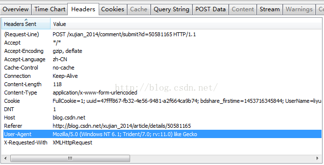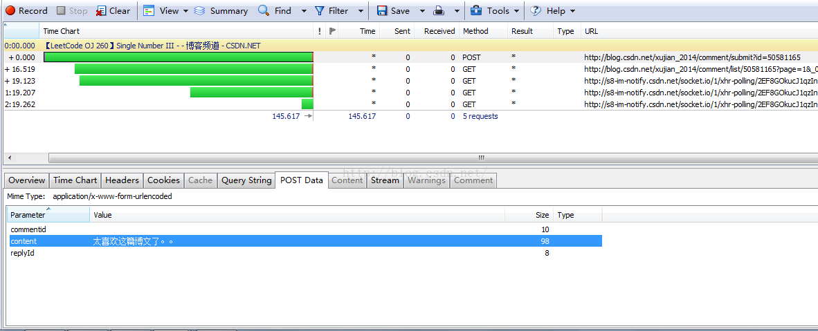 首先我們隨便打開一篇博文,將httpWatch也打開。現在在評論中輸入信息,不要立即點擊提交,先開啟httpWatch。然後提交,然後關閉,我們會得到如下界面: