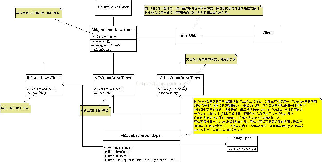3、然後通過一個TimerUtils管理類,去集中承擔子類和父類壓力,讓子類和父類所需實現功能分擔到TimerUtils類中,並且該TimerUtils管理類是與客戶端唯一打交道的類,比如獲得倒計時對象以及獲得倒計時的TextView對象都通過這個管理類分配,避免客戶端直接與倒計時的基類和子類打交道。從而使得類的封裝性和隱藏性得到體現。