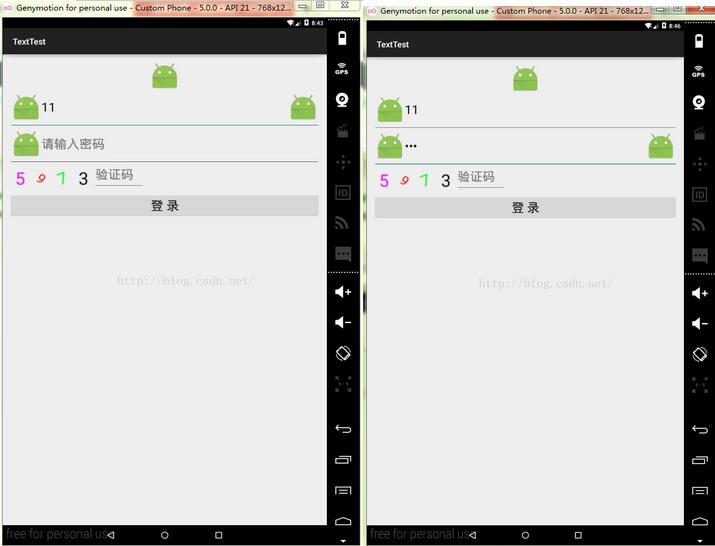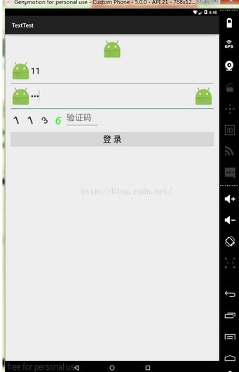<RelativeLayout xmlns:android="http://schemas.android.com/apk/res/android" xmlns:tools="http://schemas.android.com/tools" android:layout_width="match_parent" android:layout_height="match_parent" android:paddingLeft="@dimen/activity_horizontal_margin" android:paddingRight="@dimen/activity_horizontal_margin" android:paddingTop="@dimen/activity_vertical_margin" android:paddingBottom="@dimen/activity_vertical_margin" tools:context=".MainActivity"> <ImageView android:id="@+id/tv_login" android:src="@drawable/ic_launcher" android:layout_width="match_parent" android:layout_height="wrap_content" android:layout_alignParentTop="true" android:gravity="center" /> <com.example.administrator.texttest.DeletableEditText android:id="@+id/tv_user" android:layout_width="match_parent" android:layout_height="wrap_content" android:textSize="30dp" android:layout_below="@id/tv_login" android:drawableLeft="@drawable/ic_launcher" android:drawableRight="@drawable/ic_launcher" android:hint="請輸入賬戶" android:ems="10"/> <com.example.administrator.texttest.DeletableEditText android:id="@+id/tv_psd" android:layout_width="match_parent" android:layout_height="wrap_content" android:textSize="30dp" android:layout_below="@id/tv_user" android:drawableLeft="@drawable/ic_launcher" android:drawableRight="@drawable/ic_launcher" android:hint="請輸入密碼" android:inputType="textPassword" android:ems="10"/> <LinearLayout android:id="@+id/lyYanzhengma" android:orientation="horizontal" android:layout_width="match_parent" android:layout_height="wrap_content" android:layout_below="@id/tv_psd"> <LinearLayout android:id="@+id/lyVerify" android:orientation="horizontal" android:layout_width="wrap_content" android:layout_height="wrap_content"> <TextView android:id="@+id/tvHideA" android:layout_width="70dp" android:layout_height="70dp" android:visibility="gone" android:gravity="center" android:textSize="30dp" /> <TextView android:id="@+id/tvHideB" android:layout_width="70dp" android:layout_height="70dp" android:visibility="gone" android:gravity="center" android:textSize="30dp" /> <TextView android:id="@+id/tvHideC" android:layout_width="70dp" android:layout_height="70dp" android:visibility="gone" android:gravity="center" android:textSize="30dp" /> <TextView android:id="@+id/tvHideD" android:layout_width="70dp" android:layout_height="70dp" android:visibility="gone" android:gravity="center" android:textSize="30dp" /> </LinearLayout> <LinearLayout android:id="@+id/IV_num" android:orientation="horizontal" android:layout_width="wrap_content" android:layout_height="wrap_content"> <ImageView android:layout_height="70dp" android:layout_width="50dp" android:id="@+id/ivNumA"/> <ImageView android:layout_height="70dp" android:layout_width="50dp" android:id="@+id/ivNumB"/> <ImageView android:layout_height="70dp" android:layout_width="50dp" android:id="@+id/ivNumC"/> <ImageView android:layout_height="70dp" android:layout_width="50dp" android:id="@+id/ivNumD"/> </LinearLayout> <LinearLayout android:orientation="horizontal" android:layout_height="wrap_content" android:layout_width="match_parent"> <EditText android:layout_height="wrap_content" android:layout_width="120dp" android:textSize="30dp" android:id="@+id/etCheck" android:maxLength="4" android:singleLine="true" android:hint="驗證碼"/> <TextView android:layout_height="wrap_content" android:layout_width="wrap_content" android:text="結果" android:id="@+id/tvCheck" android:textSize="30dp" android:visibility="gone"/> </LinearLayout> </LinearLayout> <Button android:id="@+id/bt_login" android:text="登 錄" android:textSize="30dp" android:layout_below="@id/lyYanzhengma" android:layout_width="match_parent" android:layout_height="wrap_content" /> </RelativeLayout>