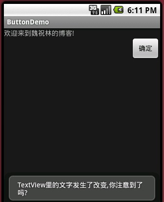 Button按鈕所觸發的事件處理,我們稱之為Event Handle,只不過在Android當中,按鈕事件是由系統的Button.OnClickListener所控制,熟悉Java程序設計的讀者對OnXxxListener應該不陌生.以下的Demo,我們將實現當點擊Button時,TextView文字將發生改變,並在屏幕上出現一段時間的Toast提醒.