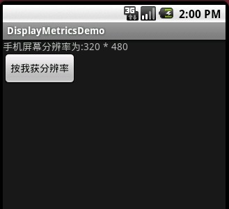 這裡主要用了三個對象TextView ,Button ,以及DisplayMetrics ,其中Displaymetrics 是取得手機屏幕大小的關鍵類,這個例子非常的簡單,當我們點擊按鈕,觸發事件,在TextView 裡顯示手機屏幕的寬高分辨率.