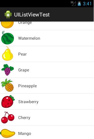 可以看到,這裡添加了一個initFruits()方法,用於初始化所有水果的數據,在Fruit類構造函數將水果的名字和對應圖片id傳入,然後把創建好的對象添加到水果列表中,接著我們再onCreate()方法中創建了FruitAdapter對象,並將FruitAdapter作為適配器傳遞給ListView.