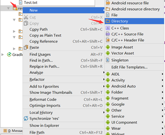 1.分別創建assets文件夾和res/raw文件夾:(要注意的raw文件是在res下new,然後創建一個名字為raw的文件夾)
