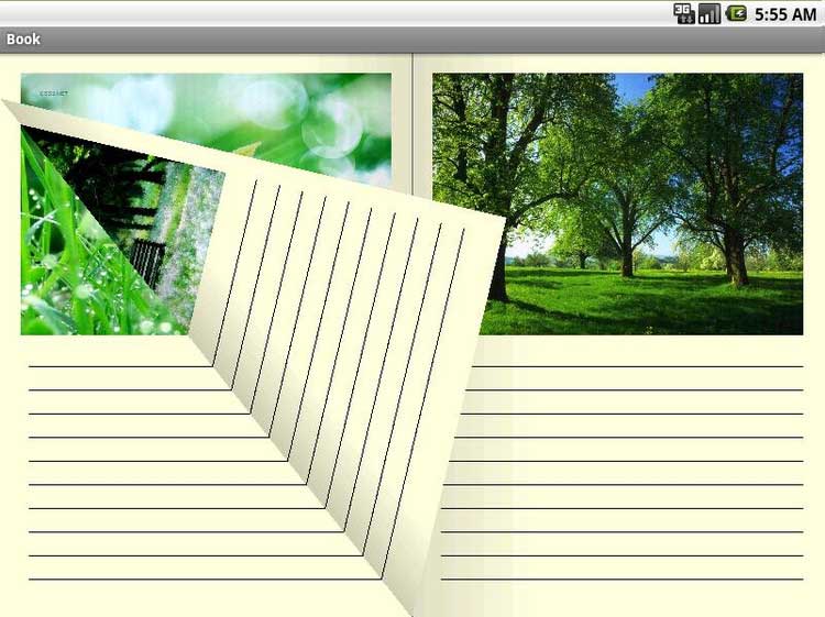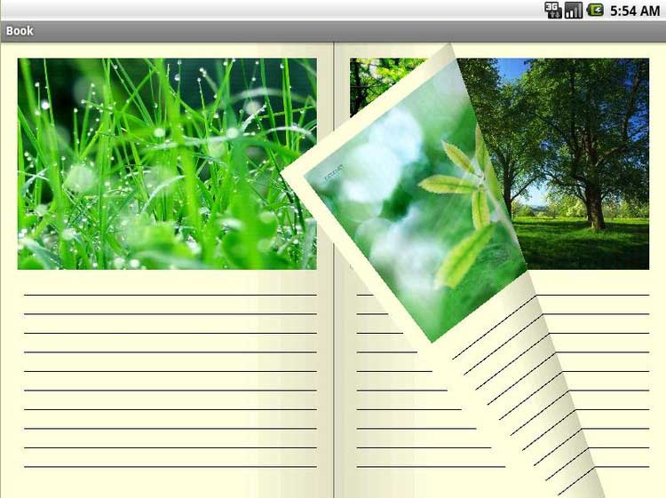 初始化:定義一個LinearLayout的成員變量mView,將page.xml inflate 成View分別用leftPage,rightPage引用,並初始化其數據,將leftPage,rightPage通過addView添加到mView,然後將mView添加到eBook。在eBook裡定義一個私有類BookView extends View。 並定義成員變量 BookView mBookView; 最後將mBookView添加的eBook中,這樣,mView中的內容為書面內容,mBookView中的內容為特效內容。