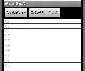 <?xml version="1.0" encoding="utf-8"?> <LinearLayout xmlns:android="http://schemas.android.com/apk/res/android" android:orientation="vertical" android:layout_width="fill_parent" android:layout_height="fill_parent"> <LinearLayout android:orientation="horizontal" android:layout_width="wrap_content" android:layout_height="wrap_content"> <Button android:text="加載ListView" android:id="@+id/Button01" android:layout_width="wrap_content" android:layout_height="wrap_content"> </Button> <Button android:text="加載另外一個頁面" android:id="@+id/Button02" android:layout_width="wrap_content" android:layout_height="wrap_content"></Button> </LinearLayout> <LinearLayout android:id="@+id/LinearLayout01" android:background="#FFFFFF" android:layout_width="fill_parent" android:layout_height="fill_parent"></LinearLayout> </LinearLayout>