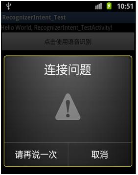 當然,如果找不到設置,就會拋出ActivityNotFoundException,所以我們需要捕捉這個異常。在以下的例子中,我們實現了一個簡單的語音識別程序,當我們點擊“點擊使用語音識別”按鈕之後,開始語音,然後在onActivityResult方法中取得結果並顯示出來,其中如果當前手機沒有連接到互聯網則會顯示連接問題,運行效果如以下所示: