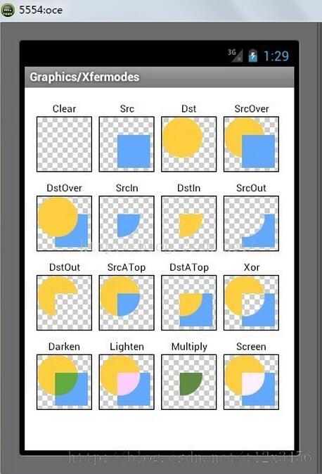 PorterDuffXfermode 這是一個非常強大的轉換模式,使用它,可以使用圖像合成的16條Porter-Duff規則的任意一條來控制Paint