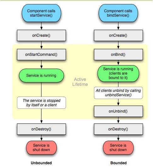 Android啟動Service有兩種方法,一種是startService,一種是bindService。生命周期如下: