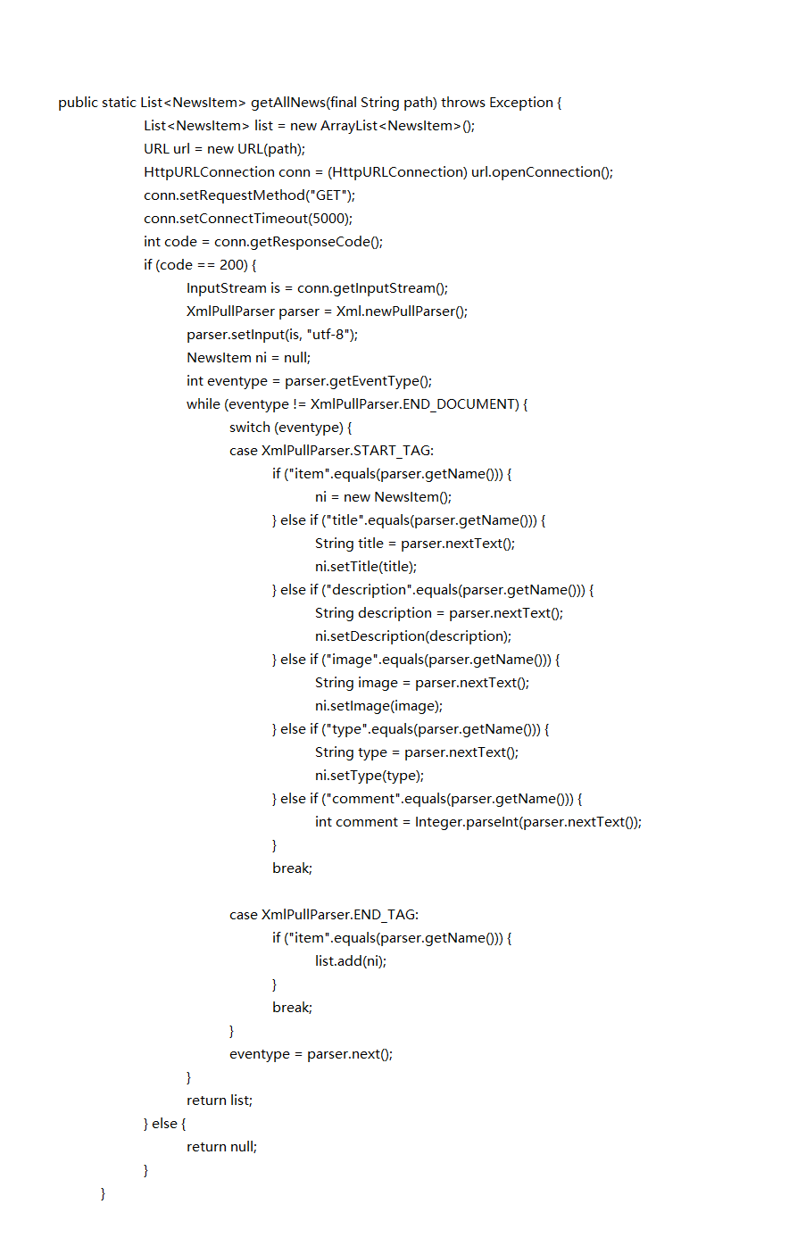 XML解析是邊讀邊解析,方法較為固定,從上到下依次解析。首先創建XmlPullParser解析器,利用解析器設置要解析的流對象。然後在一個循環中判斷標簽類型,如果遇到文件結束標(END_DOCUMENT)簽跳出循環,否則進入循環。在循環中在有兩種情況,若是開始標簽(START_TAG),進入標簽內部,根據標簽名判斷要獲取的數據,當標簽名和要得到的數據名相同時,用nextText()獲取數據。若是結束標簽(END_TAG)將獲取的數據存入集合。最後一點,不要忘記把標簽移向下一個位置,即:type = parser.next()。