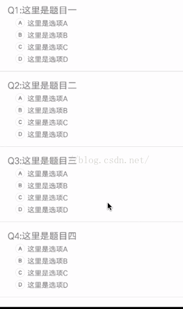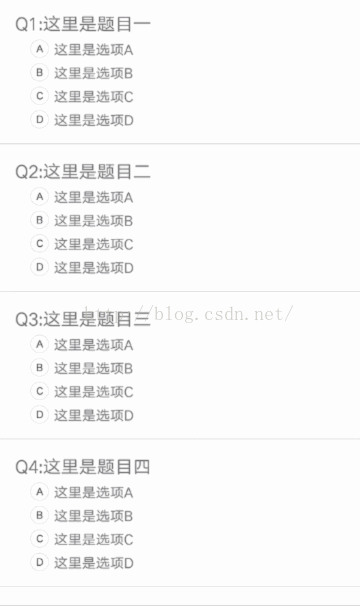 需求如圖所示,這裡面有ABCD四個選項的題目,當點擊A選項,如果A是正確的答案,則變成對勾的圖案,如果是錯誤答案,則變成錯誤的圖案,這裡當時在寫的時候覺得很簡單,只要是在點擊的時候判斷我點擊的選項與正確答案是否一樣,是一樣就將圖片換成正確的樣式,如果不一樣就換成錯誤的樣式,於是我便寫了下面的代碼(只貼出了核心Adapter中的代碼)