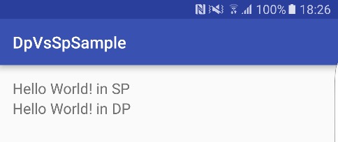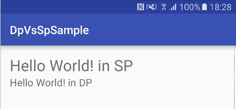 <TextView android:layout_width="wrap_content" android:layout_height="wrap_content" android:textSize="18sp" android:text="Hello World! in SP" /> <TextView android:layout_width="wrap_content" android:layout_height="wrap_content" android:textSize="18dp" android:text="Hello World! in DP" />