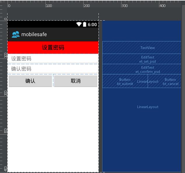 <?xml version="1.0" encoding="utf-8"?> <LinearLayout xmlns:android="http://schemas.android.com/apk/res/android" android:layout_width="match_parent" android:layout_height="match_parent" android:orientation="vertical"> <TextView android:background="#f00" android:text="設置密碼" /> <EditText android:id="@+id/et_set_psd" android:layout_width="match_parent" android:layout_height="wrap_content" android:hint="設置密碼" /> <EditText android:id="@+id/et_confirm_psd" android:layout_width="match_parent" android:layout_height="wrap_content" android:hint="確認密碼" /> <LinearLayout android:layout_width="match_parent" android:layout_height="wrap_content"> <Button android:id="@+id/bt_submit" android:layout_width="0dp" android:layout_height="wrap_content" android:layout_weight="1" android:text="確認" /> <Button android:id="@+id/bt_cancel" android:layout_width="0dp" android:layout_height="wrap_content" android:layout_weight="1" android:text="取消" /> </LinearLayout> </LinearLayout>