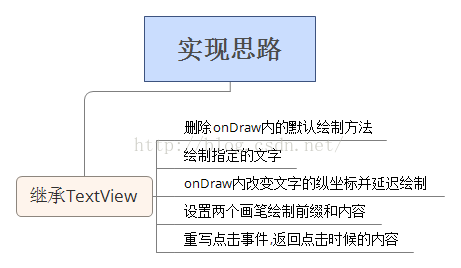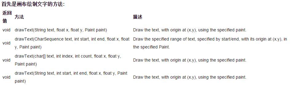 實現這個自定義View的所有參數都在上表列出了,大部分參數很容易理解,個別參數加進去是很有必要的,比如說是否初始化進入文字的縱坐標,文字是否在移動中這兩個參數,之後的內容會詳細的敘述一下. 在動手繪制之前還得需要知道一點基礎的知識,就是關於繪制文字的方法,裡面有很多細節需要處理