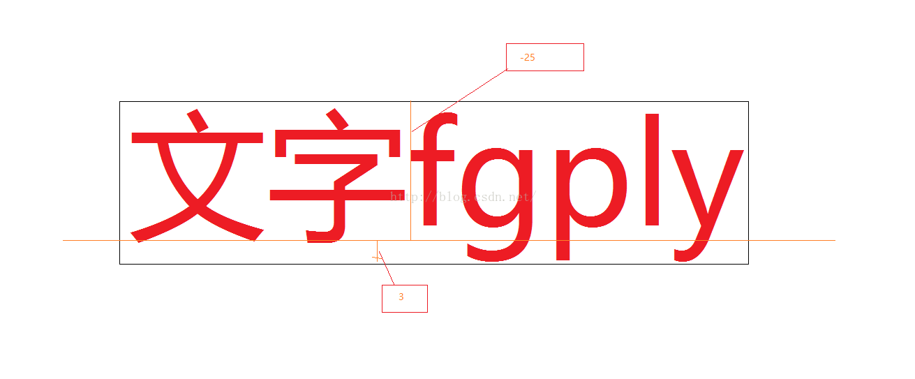 這張圖中應該會好理解實際繪制文字的坐標與組件中心坐標的關系.關於偏移值的計算,按常規的幾何計算方法,應該是組件的中心坐標+偏移值的絕對值==baseline坐標(即實際繪制的坐標),但是由於框的坐標值都是相對於baseline來計算的,top為負值,botton為正值,那麼這個偏移值就可以直接用(top+bottom)/2來表示,沒看懂的同學可以畫個草圖,用top=-25,bottom=3來算一下,看是否結果是一致的.