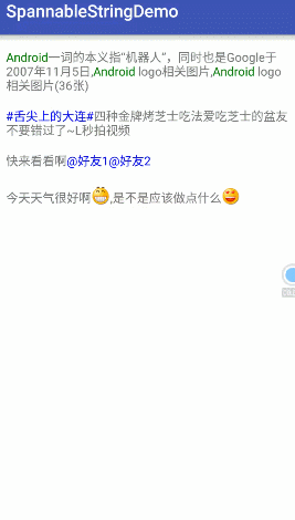 這是新浪微博的一個帖子,剛好包括了話題、表情、@好友三種顯示。顯示方法上篇已經闡述了,就是使用SpannableString。這篇主要介紹顯示這種帖子的解析工具類。