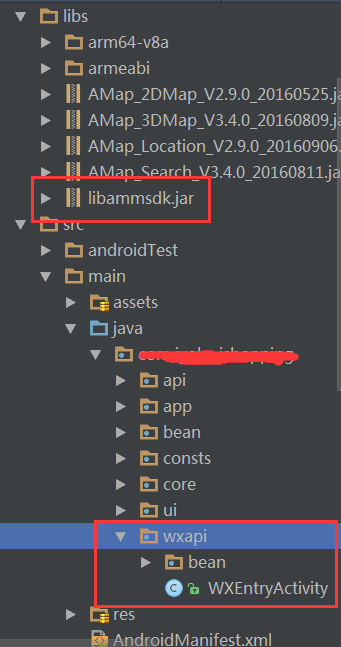 下載後把libammsdk.jar文件拷貝到AS工程的libs目錄,並把示例Demo裡源文件目錄下的wxapi目錄整個拷貝到,工程目錄的src下的根包下: