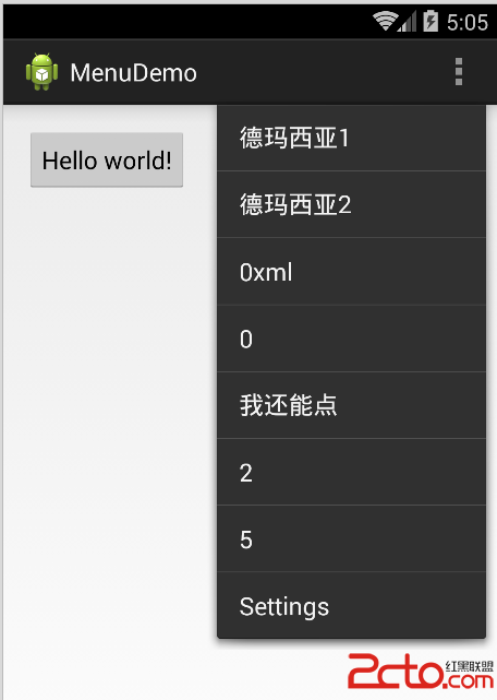 OptionsMenu(選項菜單)1.重寫Activity的onCreateOptionsMenu(Menu menu)方法,在該方法裡調用Menu對象的方法來添加菜單項