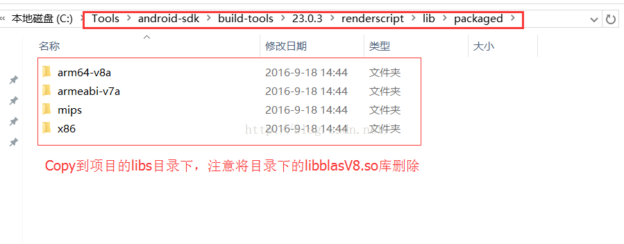 即:android sdk 路徑下 build-tools\各個版本\renderscript\lib\packaged 下的四個目錄,這裡需要注意jar包和.so版本的選擇最好選最新的,例如24.0.0中增加了x86-64的適配。