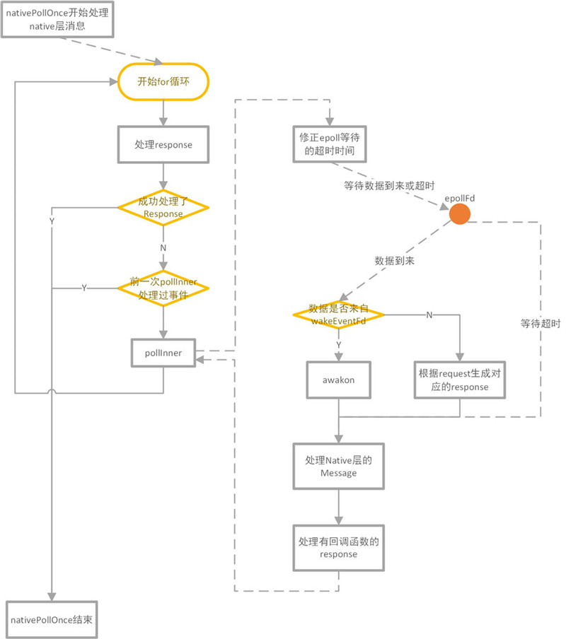 如上圖所示,在nativePollOnce中利用epoll監聽是否有數據到來,然後處理native message、native response。