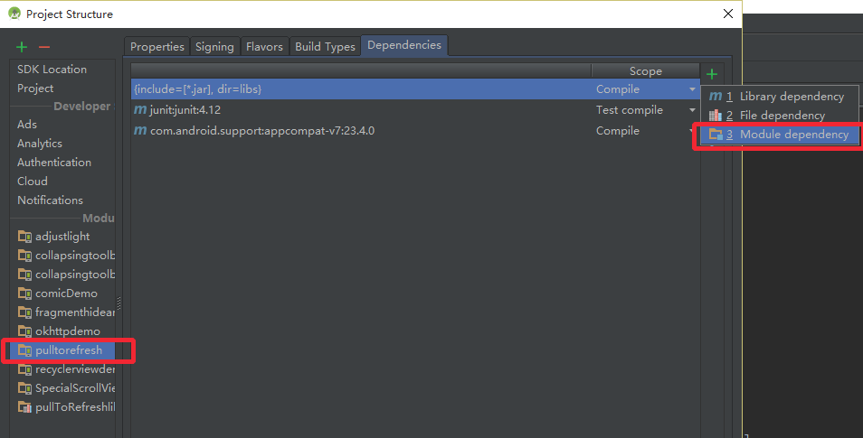 之後進入我們的project的配置中心,快捷鍵是ctrl+alt+shift+s,然後選中你想要添加上下拉刷新的module,點擊右上角的加號,選擇Module dependency