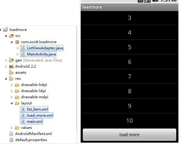 如代碼所示,我們在onCreate方法被調用時獲取listView組件,設置其底部視圖為loadMoreView,它包含一個按鈕,點擊時會 觸發loadMore方法調用,另外在為listView設置完適配器時,又為其設置了滑動事件監聽器,滑動列表時onScroll會被調用,滑動狀態改 變時onScrollStateChanged會被調用。