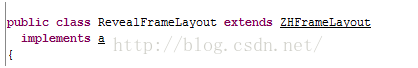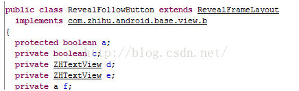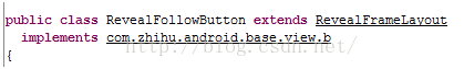 這是類的繼承關系,RevealFollowButton繼承自RevealFrameLayout,然後繼承自ZHFrameLayout,這個ZHFrameLayout的父類就是FrameLayout了,從名字我們能看出,RevelFollowButton和RevealFrameLayout就是這個效果實現的兩個類了。