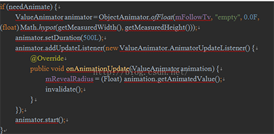 ValueAnimator animator = ObjectAnimator.ofFloat(mFollowTv, "empty", 0.0F, (float) Math.hypot(getMeasuredWidth(), getMeasuredHeight()));