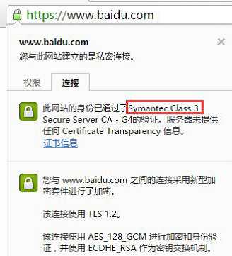 例如根證書機構Symantec 頒發給百度的就是簽名證書,是受信任的。