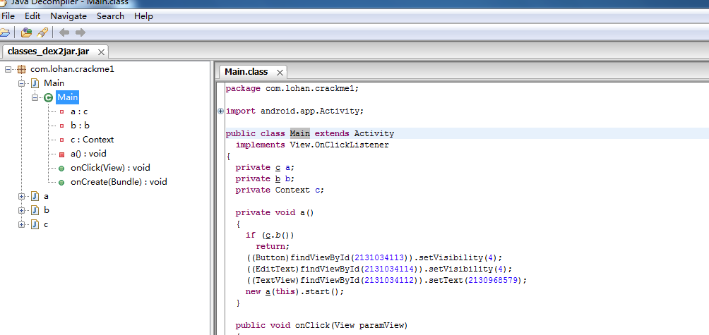 看到裡面很多的a,b,c方法,基本上可以判定是配ProGuard混淆了,不過問題也不大,雖然顯示的是無意義的函數名但是不影響我們分析代碼流程。