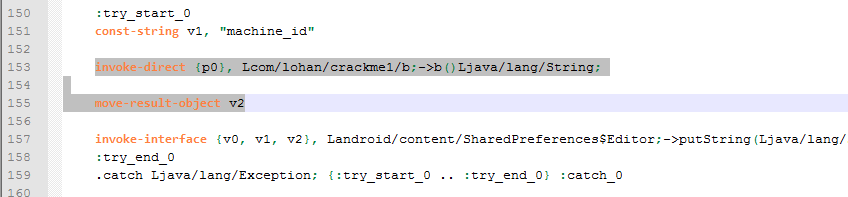 move-result-object v2 這裡代碼注入,因為這個b()的作用就是獲取當前"機器碼"(注意,這裡獲取的是沒有MD5之前的"機器碼",因為程序中的MD5都是臨時算出來的)