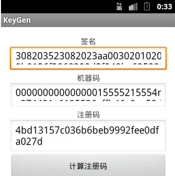 對於那個按鈕點擊事件,onClick(),它獲取用戶通過UI輸入的serial,並檢測是否和"機器碼"的MD5值相等,如果相等則存進SharedPreferences中的鍵值對中。