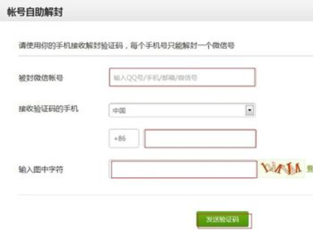 點擊進入“微信解除限制”,寫好各個選項,單擊“發送驗證碼”
