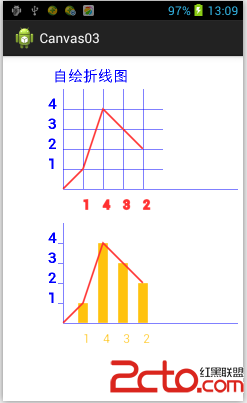 弄完柱形圖後,忽然發現,做折線圖變得很容易了。馬上 就弄了張折線圖和折線與柱形圖出來。 效果圖: 主要是利用了Android的Path,這個在這種情況下真很有用