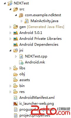 打開Eclipse,點Window->Preferences->Android->NDK,設置NDK路徑,例如我的是F:android-ndk-r10e。新建一個Android工程NDKTest,在工程上右鍵點擊Android Tools->Add Native Support...,然後給我們的.so文件取個名字(默認已經起好了,就是包名NDKTest)。這時候工程就會多一個jni的文件夾,jni下有Android.mk和NDKTest.cpp文件。Android.mk是NDK工程的Makefile,NDKTest.cpp就是NDK的源文件。