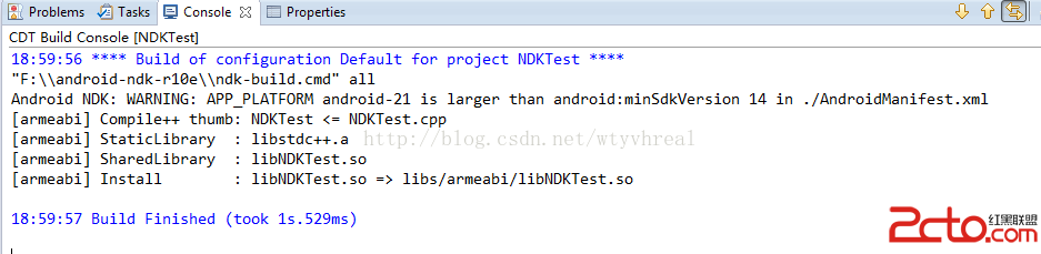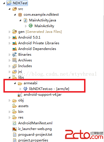 編譯運行,先編譯cpp文件,右擊工程項目NDKTest,Build Project,成功結果在libs目錄下生成了.so文件
