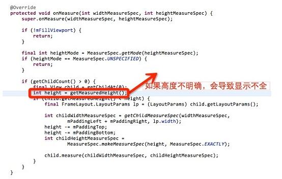 一般我們自定義的控件,嵌套在scrollview中會顯示不全,這個問題很糾結,不過當你打開scrollview的源碼,你會發現有一個地方,同時可以理解scrollview中嵌套viewpager,gridview,listview時候會顯示不全的問題了。