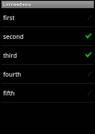 lv.setAdapter(newArrayAdapter<String>(this, android.R.layout.simple_list_item_single_choice,strs)); lv.setChoiceMode(ListView.CHOICE_MODE_SINGLE);