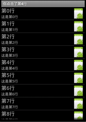 在前面講到過,ListView的職責除了填充數據外,還要處理用戶的操作。通過如下的代碼就可以為ListView綁定一個點擊監聽器,點擊後在標題欄顯示點擊的行數。