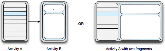 舉個例子--還是剛才那個讀新聞的程序-當你檢測到程序運行於大屏幕時,啟動activityA,你將標題列表和新聞內容這兩個fragment都放在activityA中;當檢測到程序運行於小屏幕時,還是啟動activityA,但此時A中只有標題列表fragment,當選中一個標題時,activityA啟動activityB,B中含有新聞內容fragment。