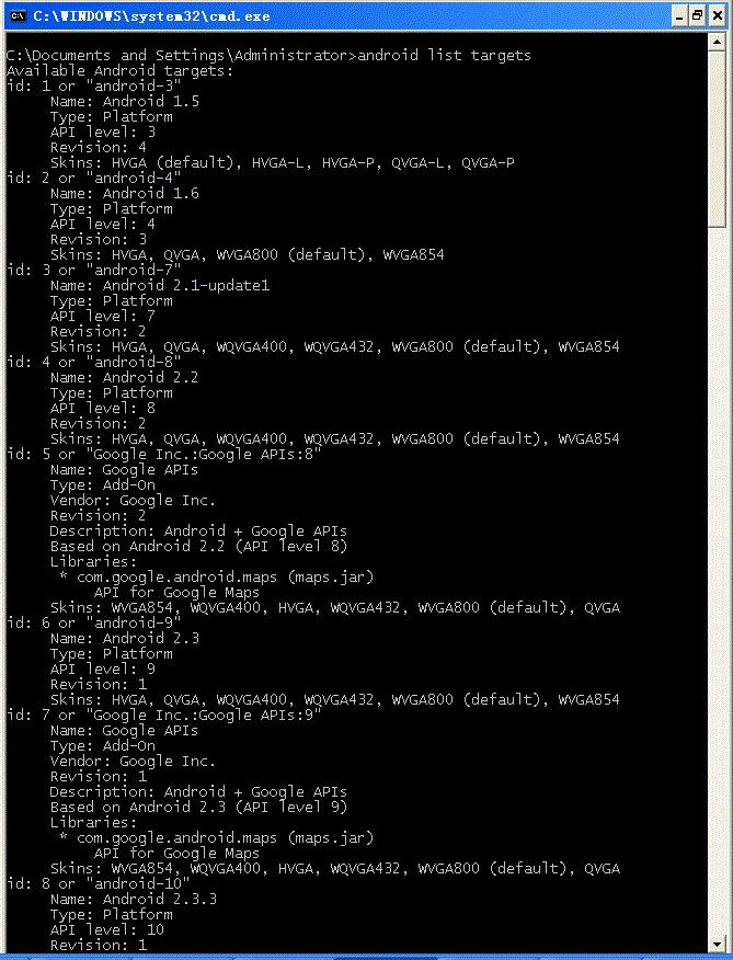 android命令是在android sdk的tools下,android.bat,相關的命令還有ddms.bat,traceview.bat等。