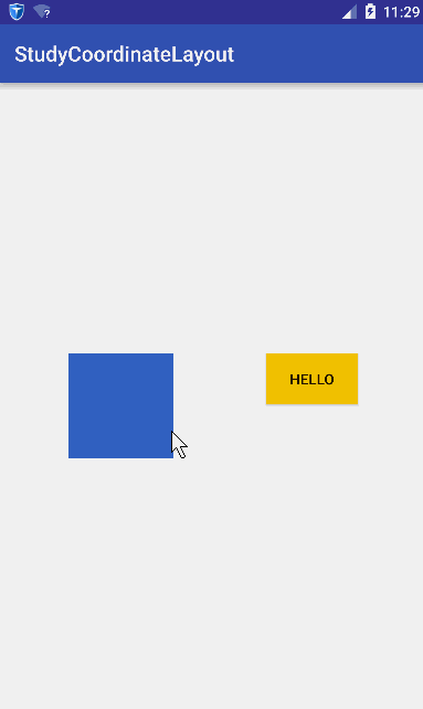 <?xml version="1.0" encoding="utf-8"?> <android.support.design.widget.CoordinatorLayout xmlns:android="http://schemas.android.com/apk/res/android" xmlns:app="http://schemas.android.com/apk/res-auto" xmlns:tools="http://schemas.android.com/tools" android:layout_width="match_parent" android:layout_height="match_parent" tools:context="com.hc.studyCoordinatorLayout.MainActivity"> <Button android:id="@+id/btn" android:layout_width="wrap_content" android:layout_height="wrap_content" android:layout_marginLeft="300dp" android:layout_marginTop="300dp" android:background="#FFCC00" android:text="Hello" app:layout_behavior="com.hc.studyCoordinatorLayout.MyBehavior" /> <com.hc.studyCoordinatorLayout.TempView android:layout_width="100dp" android:layout_height="100dp" android:layout_marginLeft="300dp" android:layout_marginTop="300dp" android:background="#3366CC" /> </android.support.design.widget.CoordinatorLayout>