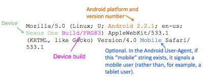 相信通過上面兩個UA字符串對比,你發現了UA的一些共性了吧,我們看看這些共性吧。 Android User Agent commonalities