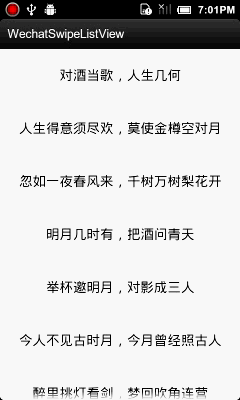 前面的文章裡面說過開源框架SwipeListView的實現原理是每個列表item中包含上下兩層view,普通狀態下上層的view覆蓋著下層的view,當用戶滑開上層的view,下層的view就顯示出來了。但是仔細觀察微信列表的item,很明顯並非這個實現方案,微信的item應該一個單層view,只不過這個item超出了所在的ListView的寬度,在用戶滑動item的時候,item超出屏幕的view則會顯示在屏幕之上,這種滑動實現也很不錯。
