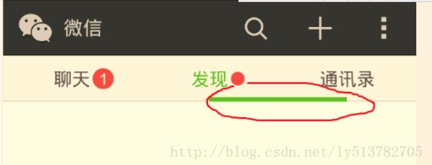 微信的主頁分為3個tab,被選中的tab的tabwidget下面會有一個高亮的長條icon,而當切換tab頁面的時候,這個icon不是等到tab切換完成後再出現在當前被選中的tab的tabwidget的下面,而是會隨著viewpager滑動頁面的動作也進行滑動,從前一個tabwidget滑到當前被選中的tabwidget,像viewpager一樣有一種粘著你的手的效果,體驗很贊。上個圖: