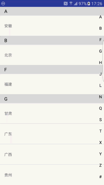 心急的朋友可以去我的github上 sideBar分支看,就是在本文的基礎上,組合一個側邊欄自定義View,然後利用TinyPinyin(https://github.com/promeG/TinyPinyin),取數據源的拼音,然後利用拼音順序排序數據源,set給Adapter,set給側邊欄,監聽側邊欄的Item切換,在回調方法裡,調用RecyclerView的scrollToPositionWithOffset(int position, int offset) 方法,滑動RecyclerView到指定位置~。
