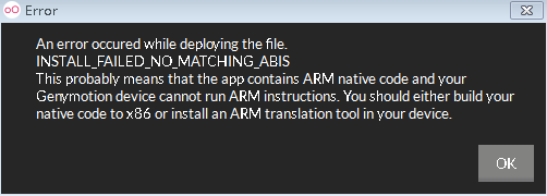 genymation模擬器是運行在CPU為X86架構的PC機上。而大多手機的CPU是ARM架構,一般APK打包也都默認是ARM。這樣就會導致很多ARM應用安裝到genymation模擬器時提示這個錯誤。