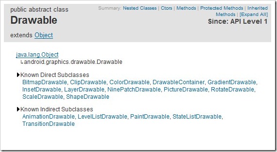 一個讓人賞心悅目的界面對軟件來說非常重要,因此圖形圖像資源也顯得非常重要。本講就要談一談Android中處理圖形圖像的最重要的一個類Drawable。Drawable就是一個可以畫的對象的抽象(有點別扭,你湊合看吧),下面是它的繼承關系,可以看到BitmapDrawable,AnimationDrawable等對象都是它的子類。