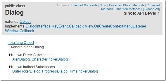 Dialog也是Android中常用的用戶界面元素,他同Menu一樣也不是View的子類。讓我們看一下它的繼承關系: